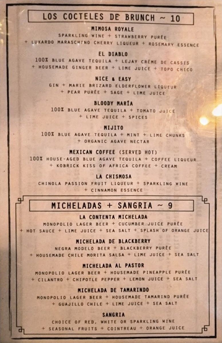 Dark lager beer, blackberry puree, housemade chile morita salsa, lime juice, sea salt.